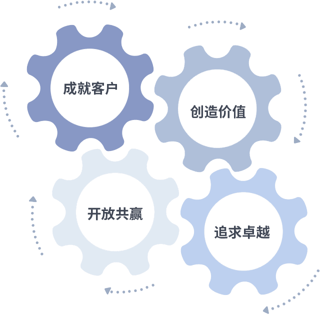 成就客户是一切决策的出发点,,创造价值是衡量所有工作的标准,,,,追求卓越是我们做事做人的态度,,,,开放共赢是我们的格局也是最终的结果。。。。价值观的齿轮环环相扣,,,,推动着组织里的每个人不断向前。。。。